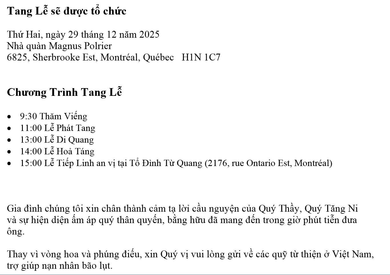 La famille Nguyen vous accueillera au Complexe funéraire Magnus Poirier, situé au 6825 Sherbrooke Est à Montréal, le lundi 29 décembre 2025 de 9h30 à 13h30, suivi de l'assistance à la crémation au crématorium Ville-Marie du Repos Saint-François d'Assise.