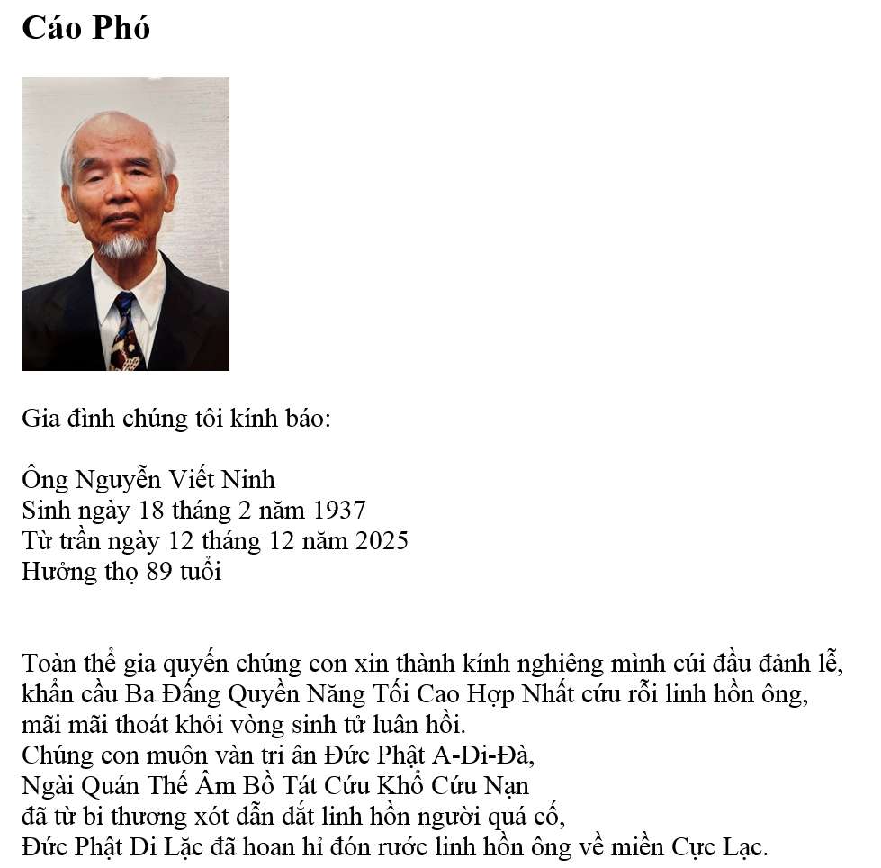 The Nguyen family announces the peaceful passing of Viet Ninh on Friday Dec. 12th, 2025, at the age of 89. On behalf of the entire family, we respectfully bow our heads in reverence, pleading the Three Most Powerful Trinity Reunited to save our deceased father's soul, so he may forever be liberated out of the cycle of birth and death. We are infinitely grateful to Amitabha Buddha and Quan Yin Bodhisattva, who compassionately guide the soul of the deceased, and the merciful Maitreya Buddha, for accompanying his soul to the Pure Land.